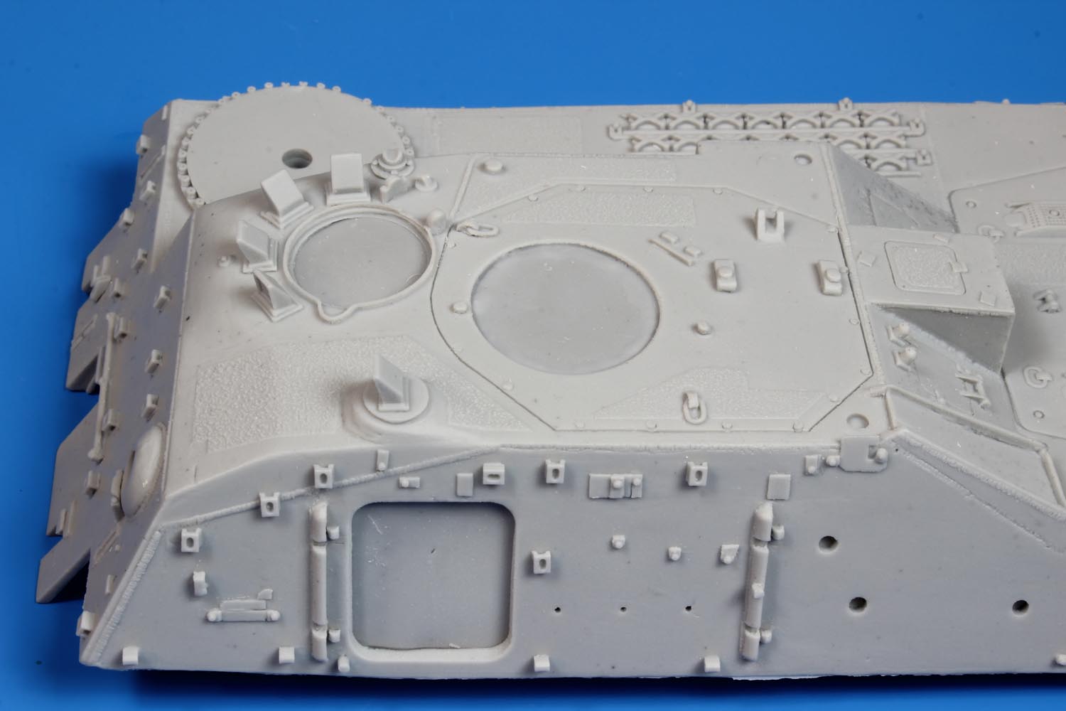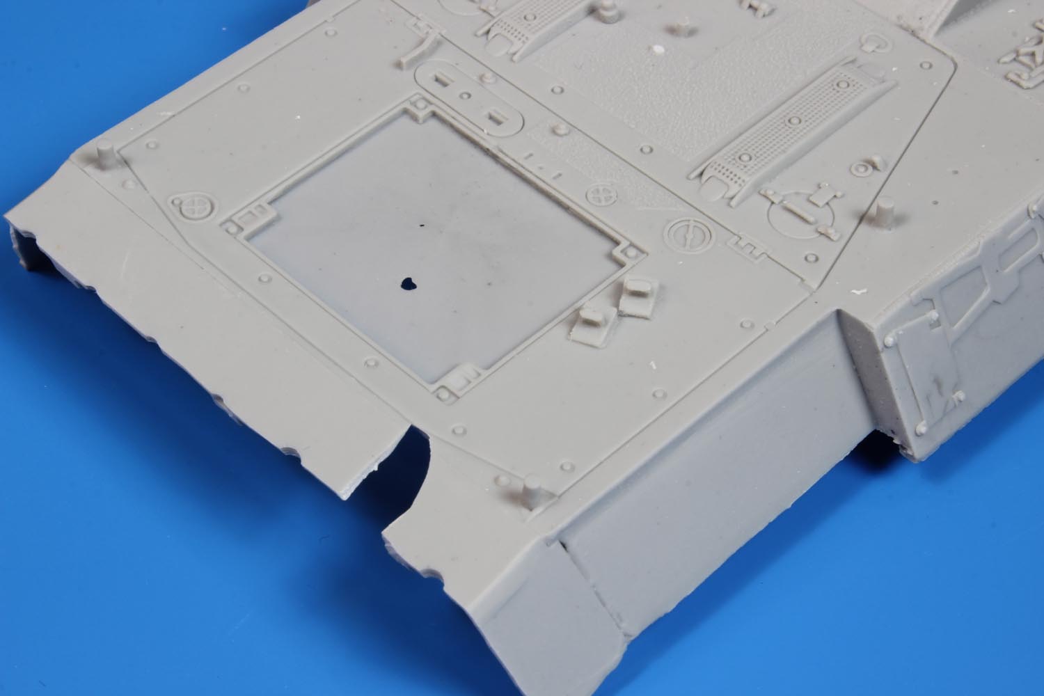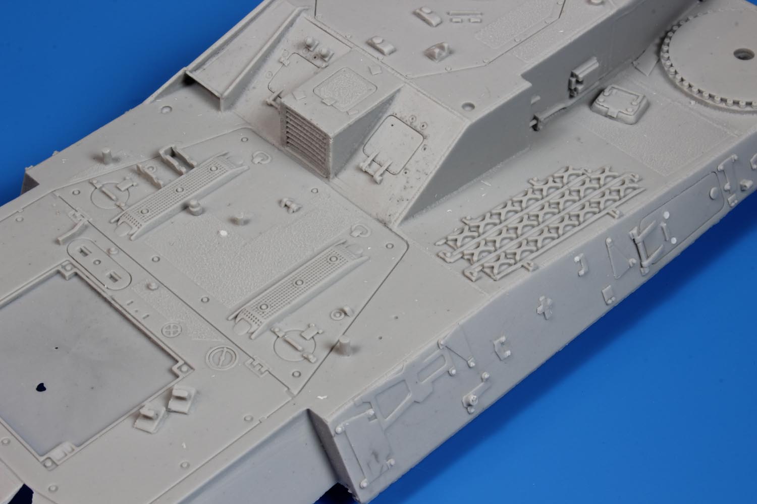 The commander's hatch, driver's hatch, and left hull side access hatch are all able to be posed open. There is no interior included in the kit. There are top notch anti-slip surfaces on the hull roof and trailing to the back deck. The weld seams on the upper hull are very nicely detailed and certainly add to the level of details visible in the kit. The engine deck will have a resin fan assembly and photo etch grille added during assembly.