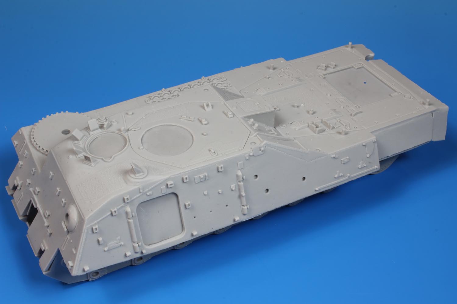 There are two primary components for the Badger hull. The upper hull and lower hull are cast in resin. There is a mandatory requirement to cut and trim the excess casting blocks in order to prepare the parts for assembly. The lower hull is not just a straight swap with a Leopard 1 lower hull and therefore the option for having this kit as a conversion is eliminated. The Badger lower hull incorporates a unique upswept angle towards the front of the lower hull, and this appears to be accurately depicted. The front of the lower hull is designed to mesh with the upper hull and includes cut outs for the onboard winch and the dozer blade hydraulic arms.