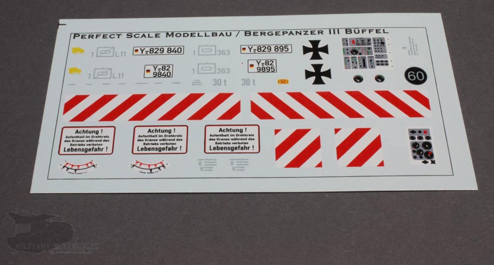 The decals supplied are of good printing quality. The colours are bold and the details well-defined. Warning signs, instruments and markings for Bundeswehr machines are provided. The markings will allow you to build an ARV3 from 1st Armoured Reconnaissance Battalion 11, or from 1st Tank Battalion 363. Decals for the markings necessary for the crane system and general warning stencils are included.