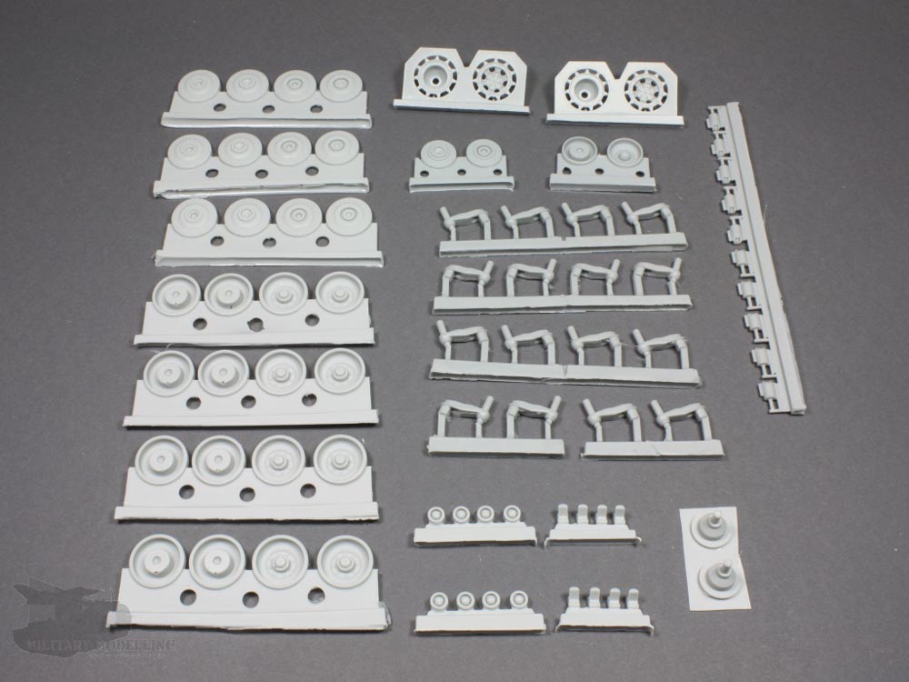 Contrary to previous editions of this kit, the suspension parts are no longer made of injection plastic from Tamiya. They are now completely cast in resin. Shock absorbers, hydraulic bump stops, swing arms, support rollers, sprocket-wheels, idlers and road wheels and - unfortunately - the link and length tracks are cast in resin. The origin of parts from Tamiya cannot be overlooked. However, the quality of the casting is perfect and shows no defects. For my opinion, only the casting blocks on the wheels are not chosen well. The casting block covers half of the tyre which has to be removed.