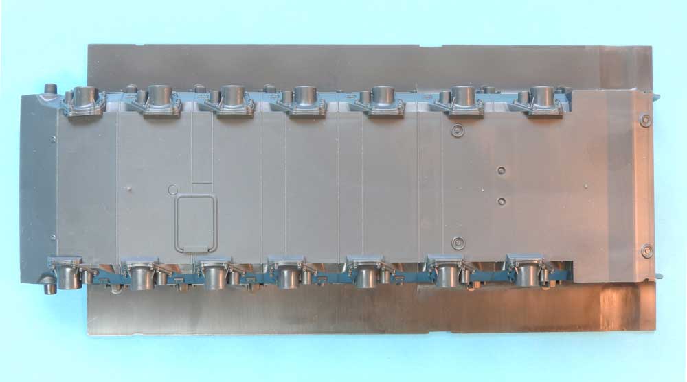 The hull tub is beautifully moulded and has location points inside for a possible future powerpack. Even the bolt holes around the sprocket mounting point are represented in the hull sides. The sides of the hull have been revised as a part of the 2A7 specification calls for added mine protection. This includes add-on panels on the side of the hull to protect the crew. These are faithfully reproduced.