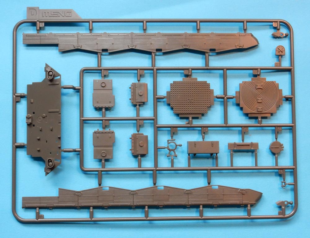 Sprue D - side skirts, rear hull plate, alternative mudflaps, alternative engine deck grilles (Greek option not needed), gun travel lock, toolbox.
