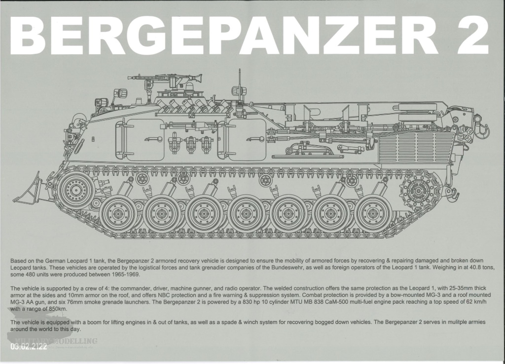 The Bergepanzer 2 Standard was based on the hull and the suspension of the Leopard 1 MBT. About 75% of the assemblies of the MBT can be found here. The tank was powered by an MTU MB 838 CaM-500, a 10-cylinder diesel engine with 830 hp. The Bergepanzer 2 was the first to receive reinforced brake discs due to its increased weight. The main tools and the recovery equipment consisted of the main winch, swivelling crane (through 270 degrees) and a 3.25-metre 'dozer blade'. The blade was used almost exclusively as a ground support to stabilise the vehicle when using the crane. Standard features included an NBC protection ventilation system, vehicle heating and a fire alarm/suppression system. Two 7.62 mm MG3 machine guns were used as weapons, one in the bow and one for air defence on the commander's cupola.The recovery of damaged vehicles, or vehicles from minefields, plus changing powerpacks in the field, were major tasks for the recovery tank. With its crane, it was able to lift loads of up to 13 tonnes depending on the angle of attack of the crane. Transporting the powerpack was another task. For this purpose, a complete pack could be carried on the rear of the vehicle.