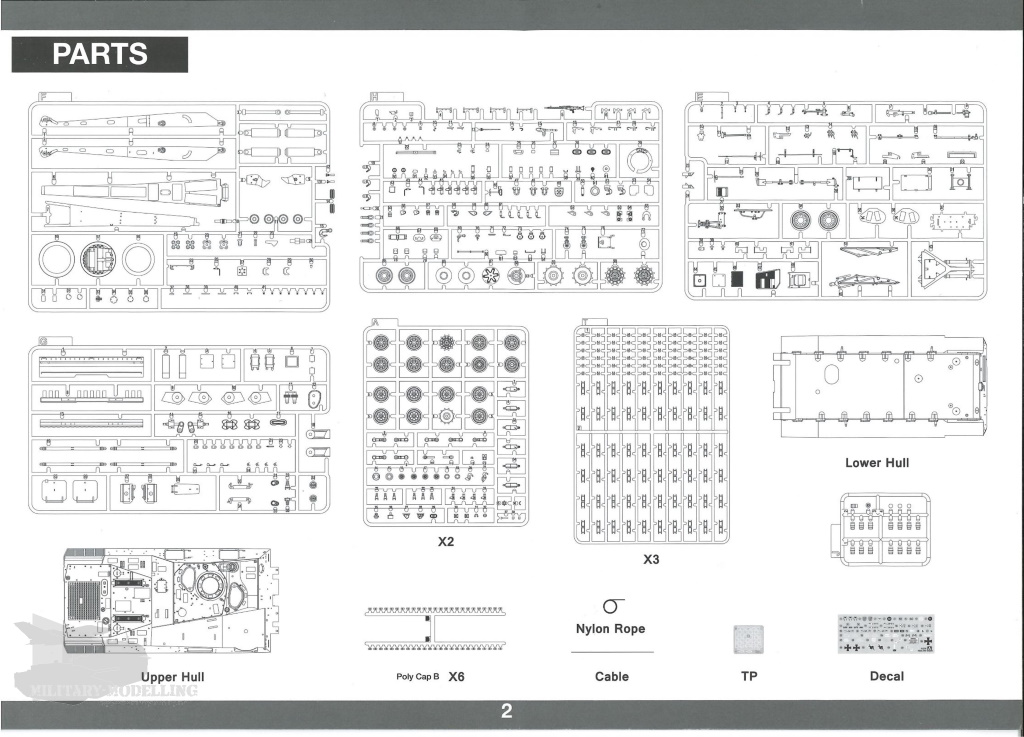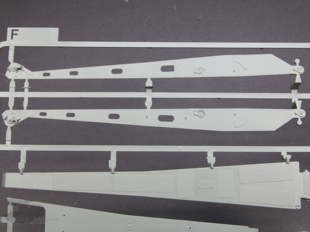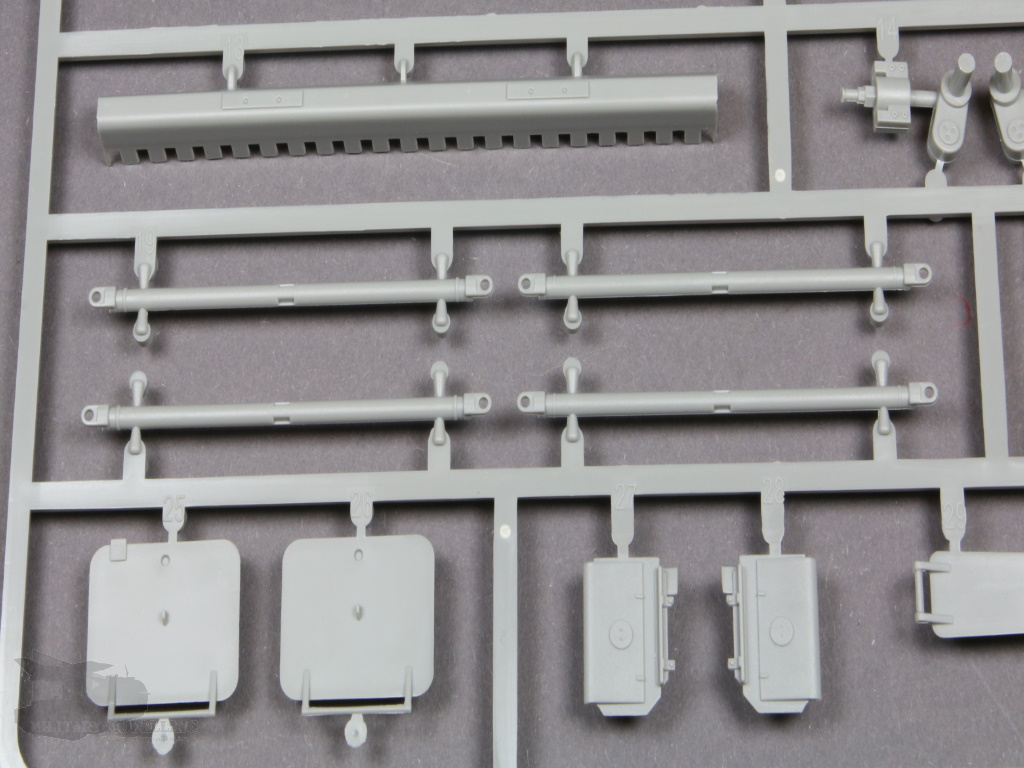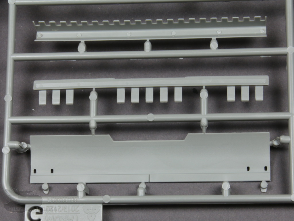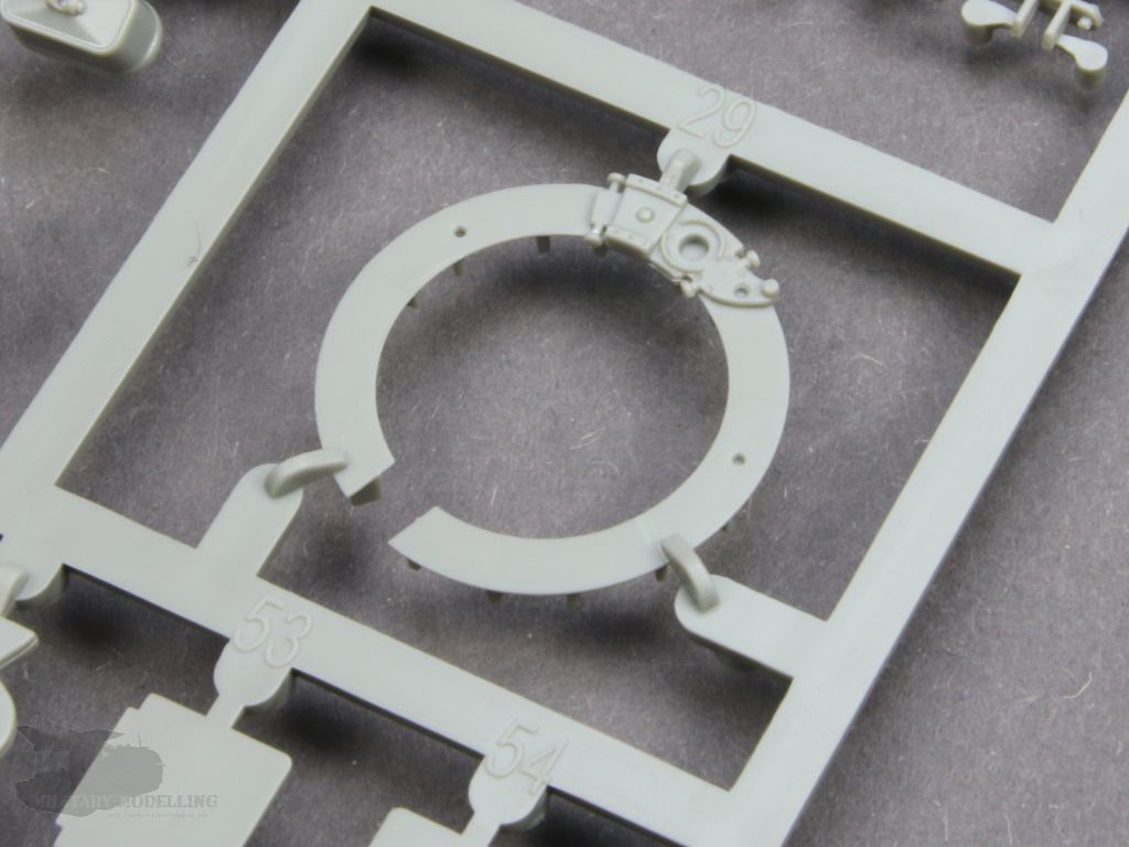 As already mentioned, the kit contains nine light grey plastic sprues as well as one made of clear plastic, plus the components for the upper and lower hull. The moulding is consistently described as the best. Ejector marks are mostly located in concealed places. Sprue gates are limited to the bare minimum and moulding seams are mostly, but not all, acceptable. Some of the sprues are already known from previous kits such as Takom's Leopard 1 and Gepard. The rest contain newly designed parts.