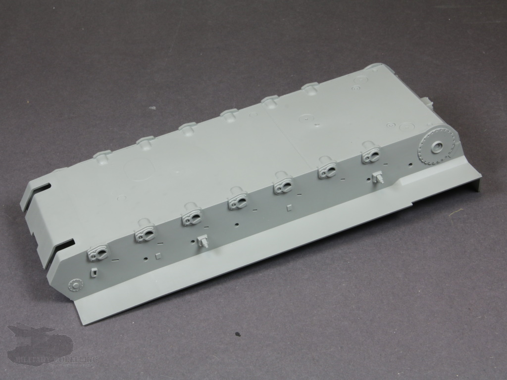 Striking, however, are the rear mud flaps. These are in one piece, folded up and quite thick. Very good alternatives are supplied by Leopard Workshop as an accessory (LW029). On the tub sides are the openings for the swing arms and the supports for the idlers. Conspicuous here are the finely detailed bolt connections of the swing arm mounts.