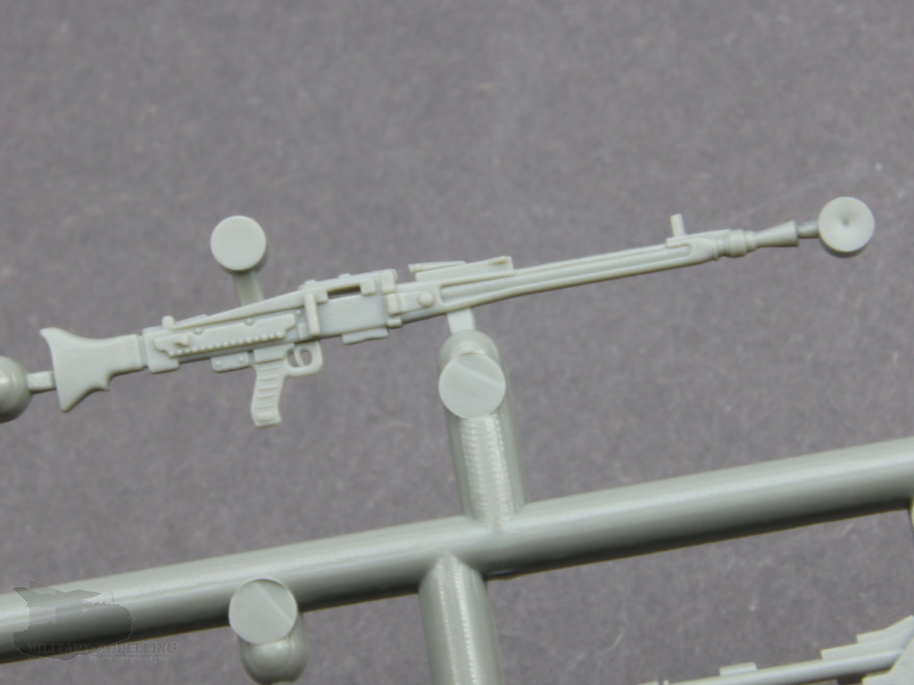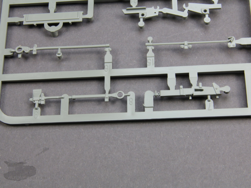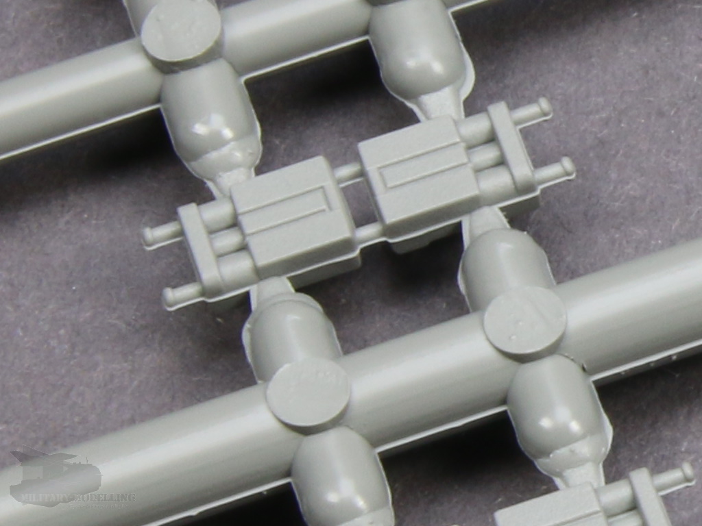 The tracks are, as in the Gepard, a single link track. On a total of three grey sprues come individual track links and central guide horns. Apart from the rubber inlays on the inside of the track body (too long), the components are well detailed. Disturbing are the four sprues of track end connectors which must be removed and press-fitted on. These are rubber vinyl mouldings. These tracks are the same as Orochi tracks which are reviewed here.