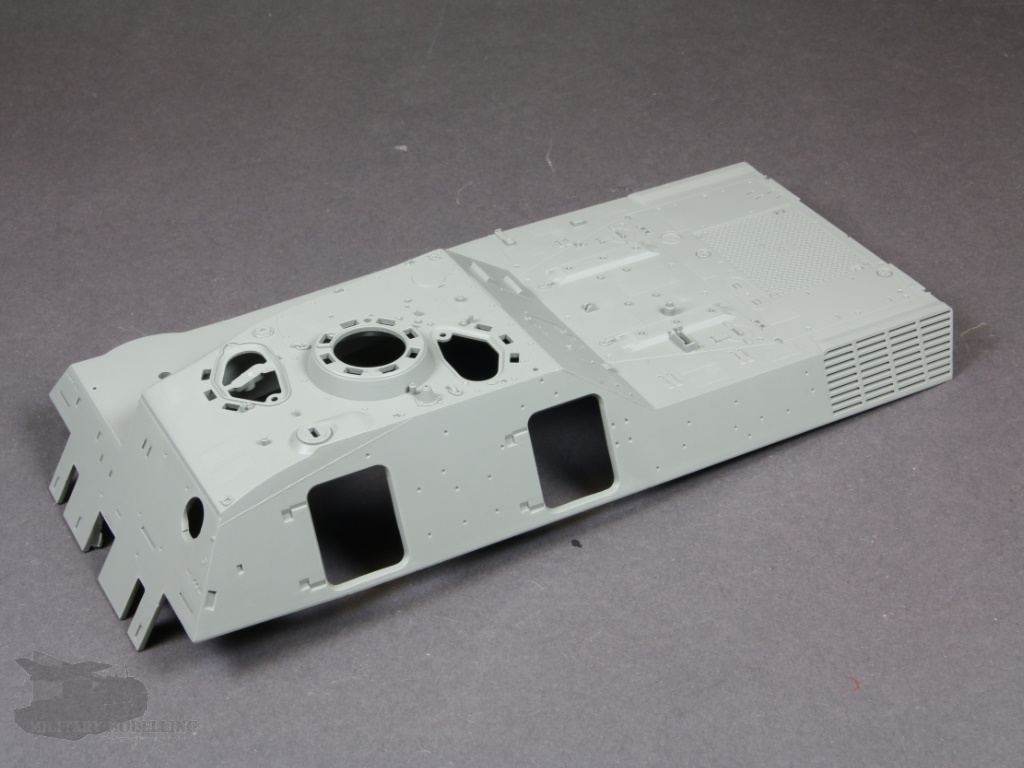 Now let us take a look at the upper hull. Here, too, is a significant, large, one-piece moulded component which really stands out with its details. Both shape and dimensions seem accurate. The details on the engine deck, the welds and the anti-slip panels, as well as eyelets and brackets, are really great. Side doors and hatches are moulded separately, so they can be posed in their openings. The cooling grille of the engine on the rear deck is already moulded in plastic with a remarkably fine structure. This is complemented by the PE grille as the top cover.