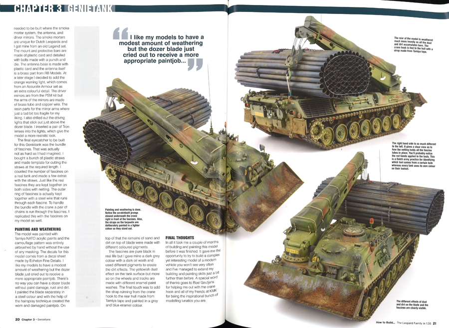 Spencer's other builds in this book are the Meng Leopard 1A3/1A4 more-or-less out of the box, a Dutch Leopard 2A4 using the recent Revell kit, plus a Bundeswehr Leopard 2A6 from Tamiya very effectively camouflaged with rubber skirts and cam nets. A real Dutch Leopard 2A6 is featured in four pages of detail walkaround shots from Rudi Meir.