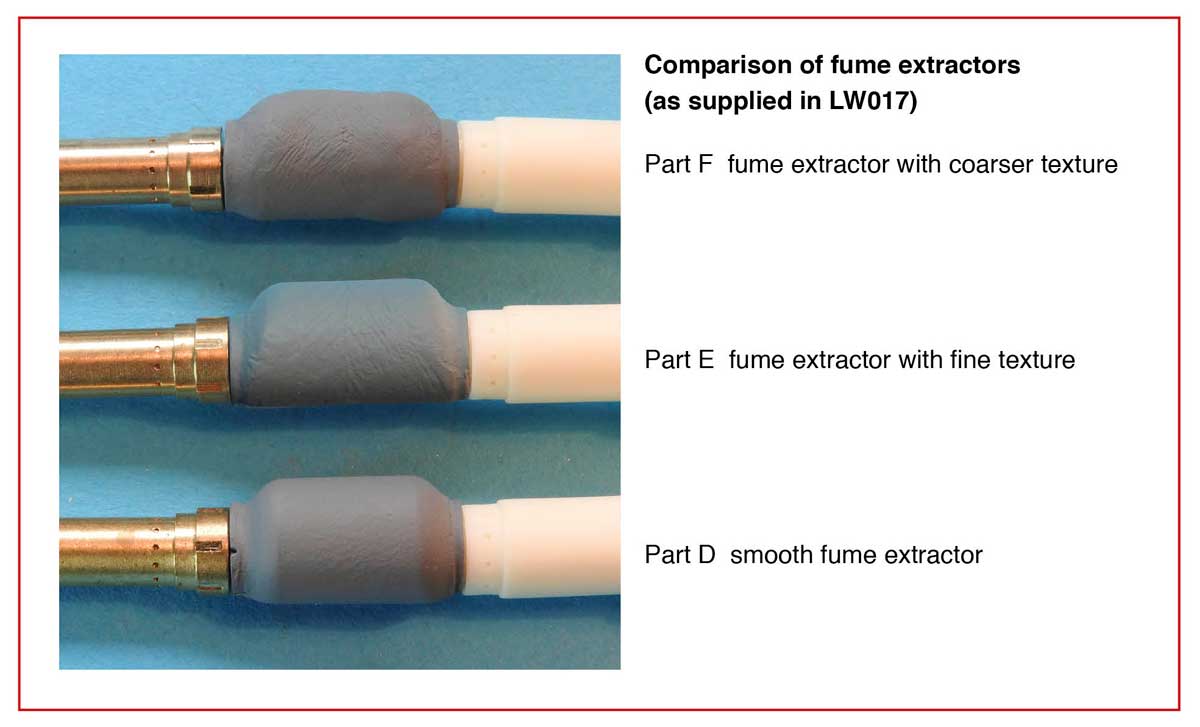 Remove the casting gates CAREFULLY. The fume extractor has a small hole at the front which needs to be drilled out to 3.2 mm. Drill this from the INSIDE/the rear. The rear has a wider opening to fit the kit mount.